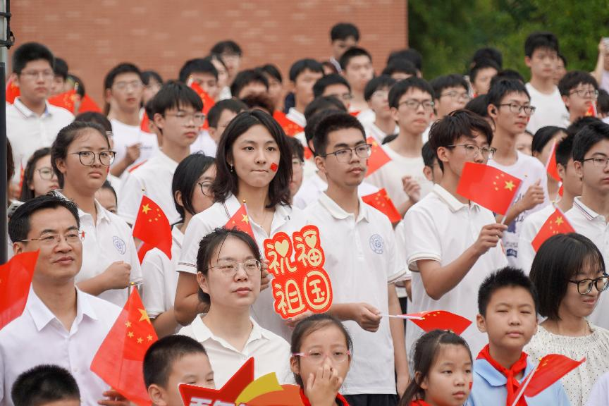 最后,计算机学院教师徐彰、会计学院教师刘智、卓越学院学生许宸恺、网络空间安全学院学生蒋婕妤、圣光机学院学生黄然、机械工程学院学生张颢泽、新疆学生代表以及在场师生共同唱响《我和我的祖国》,熟悉旋律将仪式氛围推向高潮,滚烫的爱国情怀在歌声中传递。