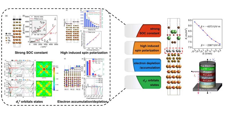 针对上述挑战,周铁军/颜士明团队持续深耕于磁性异质结的磁各向异性的电压调控机制研究。团队从理论层面出发,基于磁各向异性能的二阶微扰理论首次明确了自旋-轨道耦合(SOC)常数和自旋极化与VCMA系数的关系。在此基础上,团队进一步对具有高SOC常数的Pt原子覆盖的Pt/Fe/MgO异质结展开了轨道层面与结构调整的系统研究。计算结果进一步确认除了原子SOC常数与自旋极化外,原子附近的电荷累积/耗尽以及Pt原子费米能级附近dz2轨道能态的分布,同样是影响Pt/Fe/MgO异质结VCMA系数不可或缺的因素,四者共同决定了异质结的磁各向异性的电场响应。