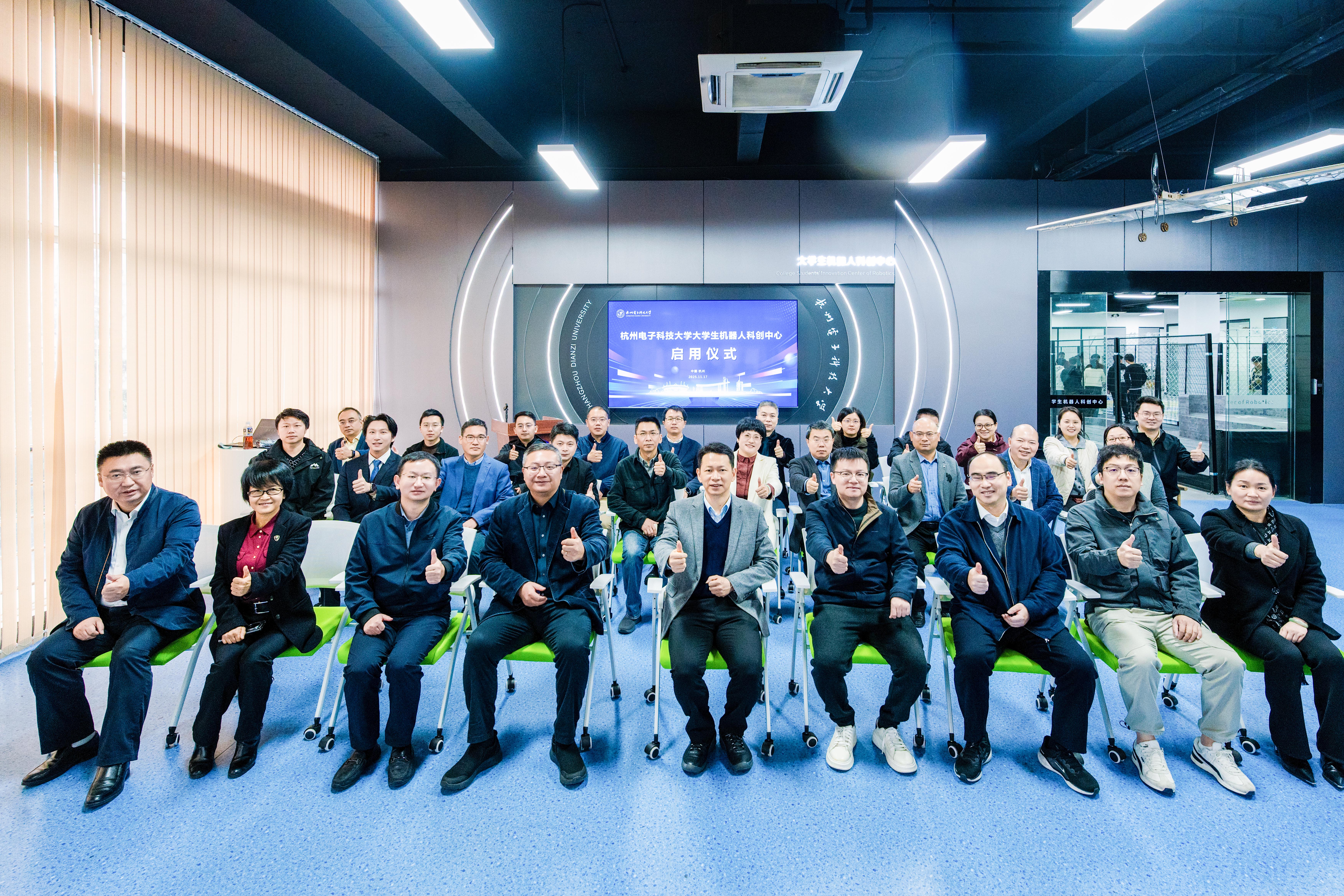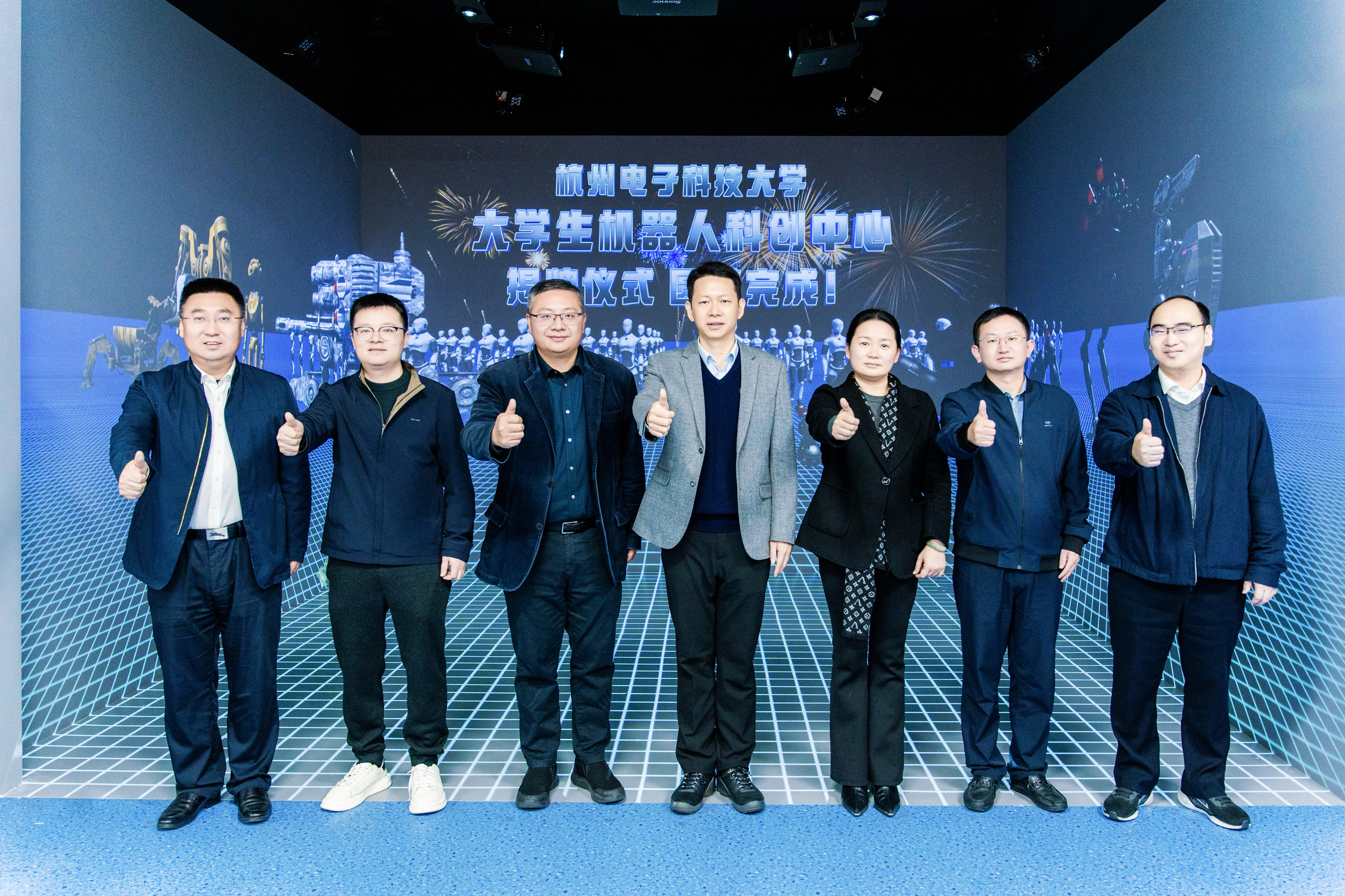 在全体嘉宾和师生的共同见证下,校领导与企业嘉宾共同为“杭州电子科技大学大学生机器人科创中心”揭牌,现场掌声雷动,标志着中心正式投入使用。