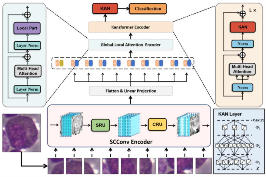 恶性肿瘤(如急性白血病)的发病率和死亡率显著上升。临床上,医院依靠外周血和骨髓涂片的细胞学检查来诊断恶性肿瘤,准确的血细胞计数至关重要。现有的自动化方法在处理高维显微图像数据时面临特征表达能力低、可解释性差以及特征提取冗余等问题。论文提出了一种用于骨髓血细胞的新型细粒度分类模型SCKansformer,该模型解决了上述问题,并提高了分类的准确性和效率。该模型集成了Kansformer编码器、SCConv编码器和全局-局部注意力编码器:Kansformer编码器用KAN替代传统的MLP层,提高了非线性特征表示能力和可解释性;SCConv编码器通过空间和通道重建单元增强了特征表示并减少了冗余;全局-局部注意力编码器结合了多头自注意力机制和局部部分模块,以捕获全局和局部特征。