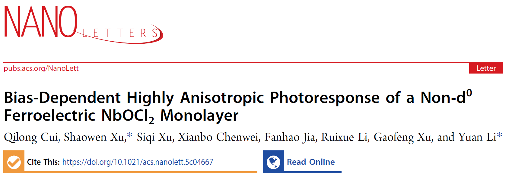 近日,理学院李源教授课题组的研究成果“Bias-Dependent Highly Anisotropic Photoresponse of a Non-d0 Ferroelectric NbOCl2 Monolayer”被纳米领域国际顶级期刊《Nano Letters》录用并在线发表。该工作通过密度泛函理论(DFT)与非平衡格林函数(NEGF)相结合的计算方法,系统揭示了二维铁电材料NbOCl2的独特光电响应机制,为设计具有面内极化调控功能的新一代光电器件提供了理论依据。论文第一作者为2023级物理学硕士研究生崔奇龙,通讯作者为李源教授、国科大杭州高等研究院许少文博士。