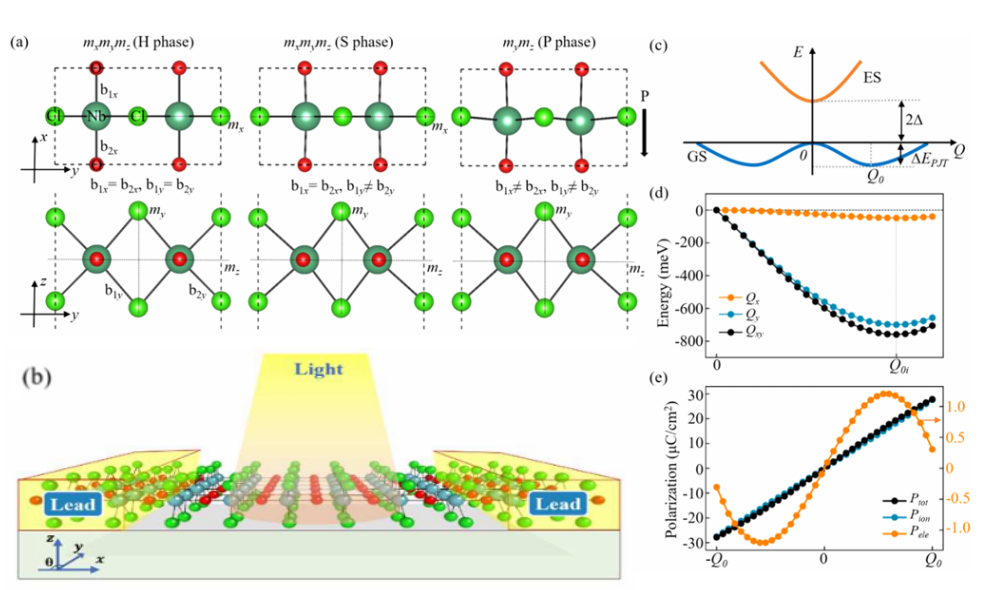 二维铁电材料因其可调控的电极化特性,在非易失性存储器、传感器与光电探测等领域展现出巨大潜力。二氯氧化铌(NbOCl₂)作为一种新兴的非d0型面内铁电材料,其极化源于双模pseudo Jahn-Teller不稳定性,不仅产生显著的能隙,还协同诱导出以离子性为主的自发铁电极化。本研究发现:NbOCl2在极轴方向(Nb–O–Nb)与非极轴方向(Nb–Cl–Nb)的光响应表现出强烈各向异性。在外加偏压作用下,极轴方向的光响应呈现系统性增强并伴随明显偏移。这一发现揭示了极化诱导内建电场对光电输运的调控作用,为理解面内铁电材料的光电耦合机制提供了新视角,也为开发具有极化导向功能的光电半导体器件奠定了理论基础,展现了NbOCl2在下一代高性能、可调控光电子器件中的应用前景。