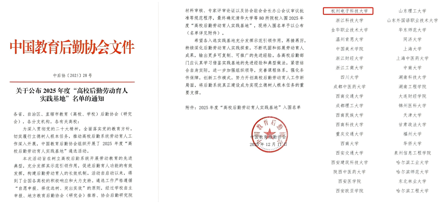 12月12日,中国教育后勤协会正式发布2025年度“高校后勤劳动育人实践基地”入选名单,杭州电子科技大学凭借扎实的劳动教育实践成果成功入选,成为全国80所入选高校之一。