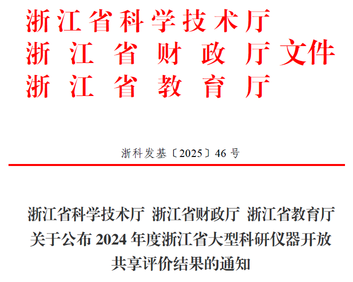 近日,省科技厅、财政厅、教育厅联合公布2024年度大型科研仪器(以下简称“大仪”)开放共享评价结果,我校荣获“优秀”等级。本次参评单位共有133家,仅14家获此殊荣,其中省属高校仅有4所。这是自浙江省开展此项评价以来,我校首次获此荣誉。