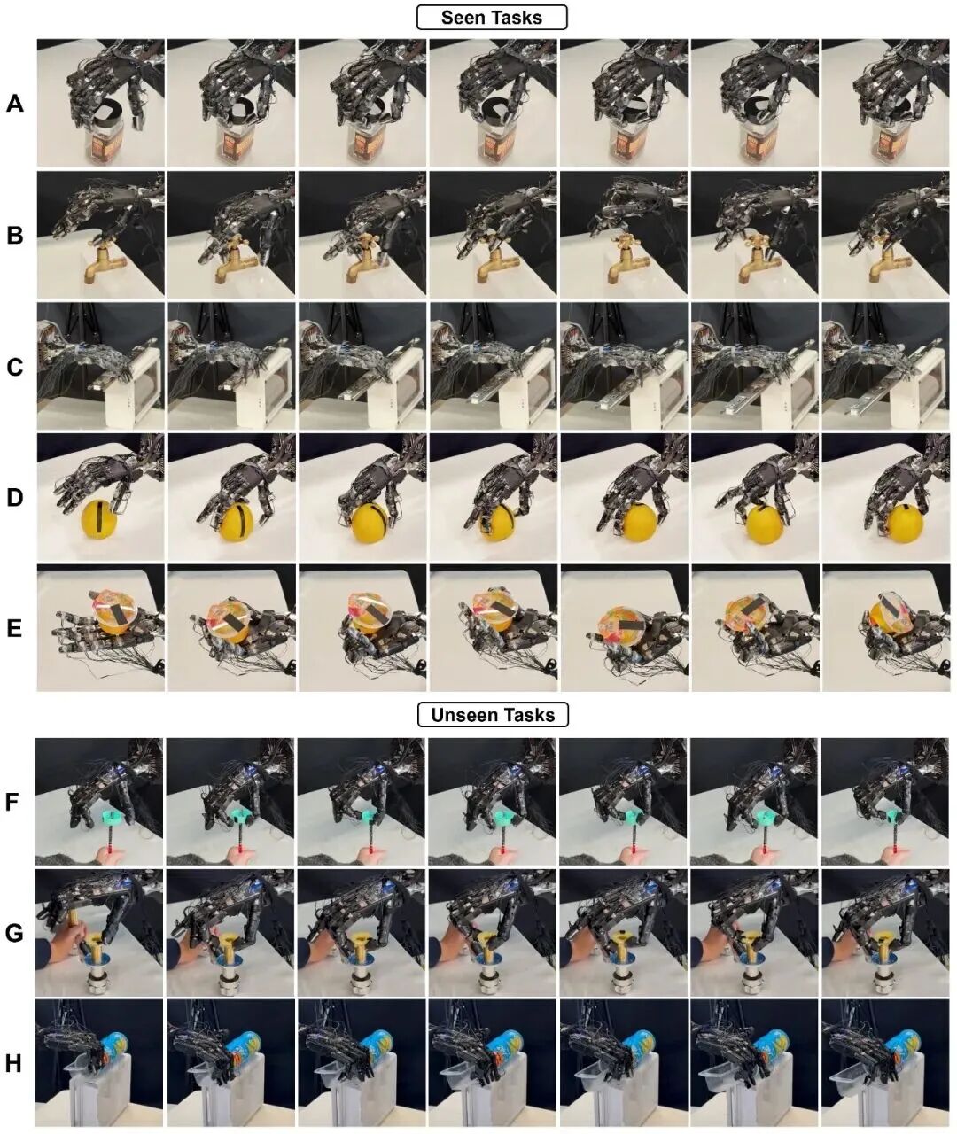 该研究通过模仿人类的学习范式(观察与实践),让机器人仅通过单目RGB相机和低成本的二值触觉传感器,就掌握了包括转瓶盖、拧水龙头、滑动滑块等在内的多种复杂技能,并表现出了惊人的泛化能力和“类人”的操作特性。