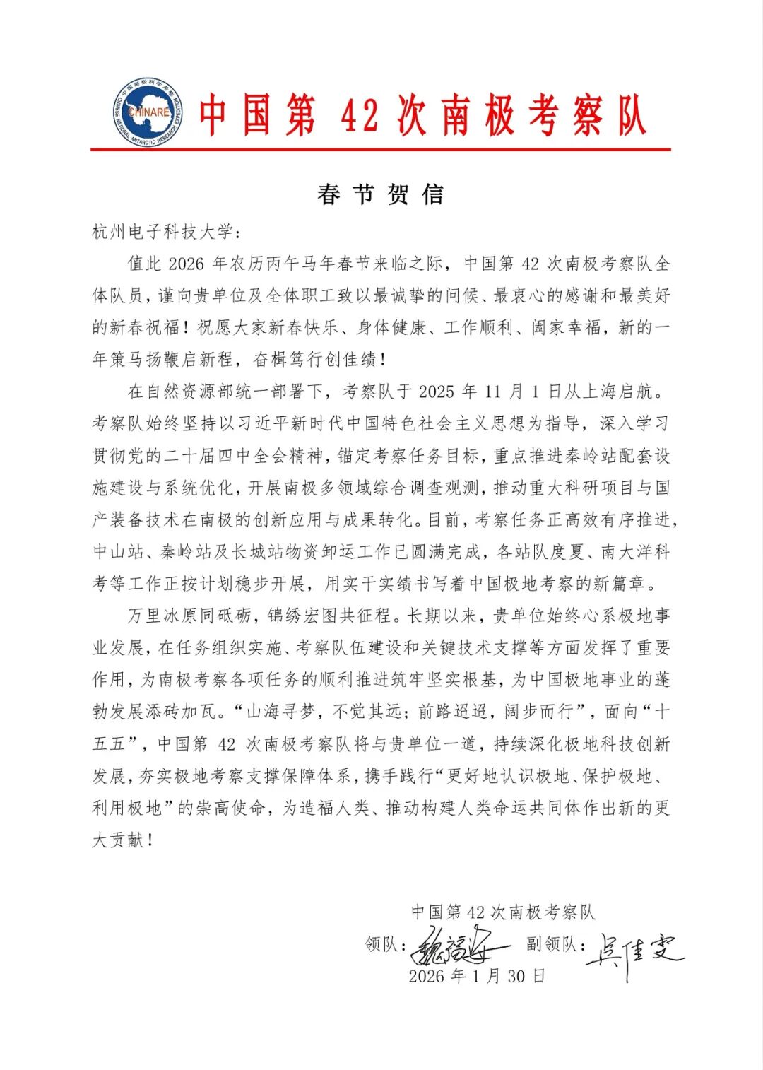 2026年农历新春佳节来临之际,中国第42次南极考察队向我校发来了一封情真意切的《春节贺信》,向杭州电子科技大学全体师生职工致以诚挚问候和美好祝福,并对我校在极地科考任务组织实施、关键技术支撑等方面所作的重要贡献表示衷心感谢。大年初二,我校科考队员发来拜年视频了!