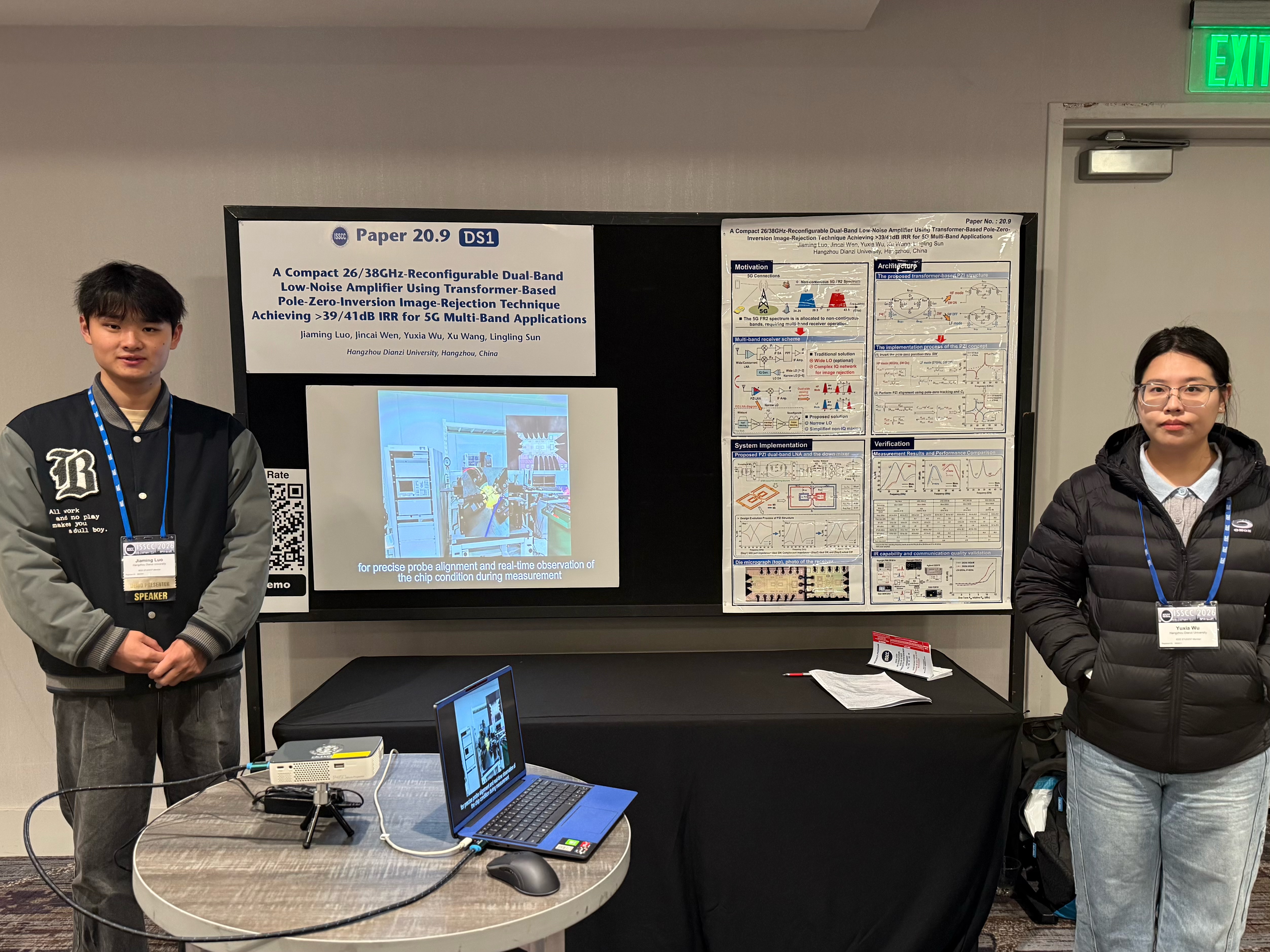 该芯片成果受邀在会议成果演示(Demonstration)环节同步展出。研究生罗佳明、吴瑜瑕围绕芯片设计方案、技术特点与应用价值,同参会专家、学者及业界人士展开深入交流与研讨,相关工作获得了广泛认可与好评。