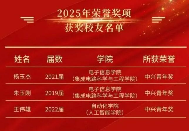 近日,中兴通讯股份有限公司向我校发来喜报,祝贺我校多名校友在2025年度工作中表现优异,荣获“中兴青年奖”等重要荣誉。喜报中,中兴通讯对我校持续输送高质量人才表示衷心感谢,并期待未来深化产教研合作,协同培养更多创新型人才。根据喜报,我校三位校友榜上有名:杨玉杰,2021届毕业生,现就职于中兴通讯,荣获“中兴青年奖”;朱玉刚,2019届毕业生,现就职于中兴通讯,荣获“中兴青年奖”。王伟雄,2022届毕业生,现就职于中兴通讯,荣获“中兴青年奖”学院寄语电子信息学院(集成电路科学与工程学院):学院对杨玉杰、朱玉刚两位校友取得的成绩表示热烈祝贺!希望你们在未来的工作中继续锐意进取,勇毅笃行,以更卓越的创新成果为时代科技进步贡献智慧与力量。同时,学院也衷心感谢中兴通讯对校友的培养与认可,以及长期以来对我院人才培养工作的大力支持。自动化学院(人工智能学院):学院对优秀校友王伟雄取得的成绩致以最诚挚的祝贺!愿你们在未来的征程中,继续秉持初心,开拓创新,以更坚实的步伐攀登事业高峰,用智慧与担当为社会进步注入更多活力。同时,学院也由衷感谢各用人单位对校友的悉心栽培与高度肯定,以及长期以来对我院发展的热忱