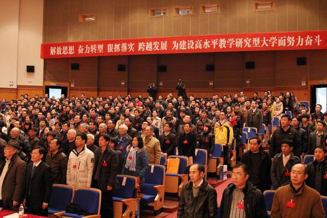 费君清在报告中说,本次大会是在学校改革发展关键时期召开的一次重要会议。大会的主题是:以邓小平理论和“三个代表”重要思想为指导,深入贯彻落实科学发展观,认真总结过去五年的工作,提出新一届党委工作思路和目标任务,进一步解放思想,奋力转型,狠抓落实,跨越发展,为把我校建设成为特色明显、省内一流、国内知名的高水平教学研究型大学而努力奋斗。