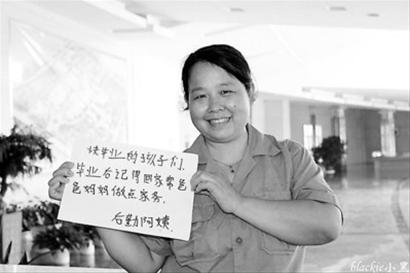 记者昨日联系到该校11号宿舍楼的管理员、40多岁的李忠欣女士。其中一张照片就是她拿着祝福纸板,上面写着:“11号楼的男生们,毕业以后,工作再忙,也要早点休息,不要忘了11号楼是你的家呀!(图1)”该校学生胡俊强留言说:“这个阿姨超好的,我们11号楼男生的福气啊。”“阿姨你出名了,照片都上网了。”这两天有学生跟李忠欣说。她向记者回忆道,上周有一男一女两名学生请她写毕业祝语,“当时一点准备都没有,还有点紧张呢”,她想到平时有的宿舍很晚才熄灯,就写下了上面的话,希望学生们在工作后多注意身体。两年的朝夕相处,让她和这些孩子们很有感情。