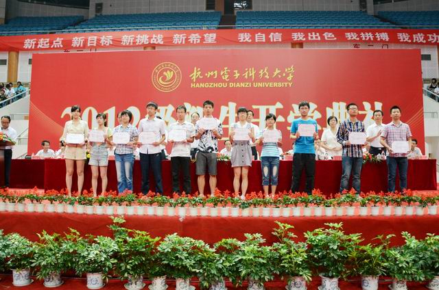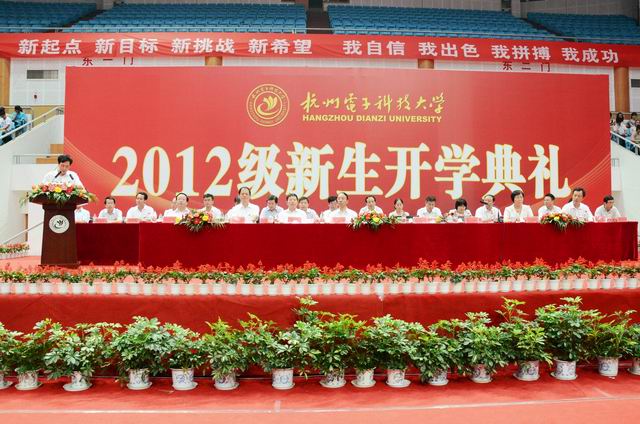 9月12日,下沙校区体育馆内横幅高挂,鲜花簇拥,我校2012级本科生、研究生开学典礼在此隆重举行,4800余名来自天南地北的年轻学子怀揣希望与梦想相聚于斯,开启一段探索真理、追逐理想的新征程。校领导费君清、薛安克、方华、金一斌、冯浩、孙玲玲、朱泽飞、郑宁,各学院领导班子成员、各职能部门负责人、教师代表、高年级学生代表、军训教官等出席开学典礼,典礼由校党委副书记金一斌主持。