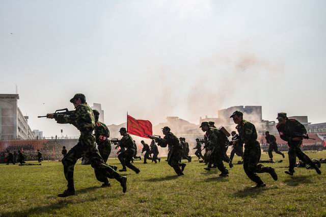 与往年不同的是,今年的军训阅兵式除传统的军体拳表演外,还增加了方阵旗语展示和战术方阵对抗演习。整齐划一、铿锵有力的旗语展示了军人令行禁止、步调一致的严明纪律。而对抗演习则模拟现代战争场景,参加演习的学员们在弥漫的硝烟和震耳欲聋的枪炮声中,或冲锋陷阵,或匍匐前进,跨障碍,越战壕,没有丝毫畏惧,向着“敌军”的大本营勇敢前进,出色的表现给到场领导和部队首长留下了深刻印象。