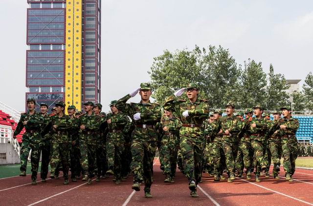 军训师各团方阵踏着矫健的步伐,喊着嘹亮的口号,依次通过主席台接受部队首长和学校领导的检阅