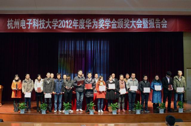 12月18日下午,学校在科技馆报告厅举行2012年度“华为奖学金”颁奖大会。副校长朱泽飞,华为公司杭州研究所人力资源部部长赵亚军、对外合作经理章校东、招聘经理蒋小伟等出席颁奖大会,并为24名“华为奖学金”获得者颁发荣誉证书。研究生院、研工部、学生处、招就处负责人,相关学院学生工作负责人,以及我校400余名研究生和本科生参加颁奖大会。