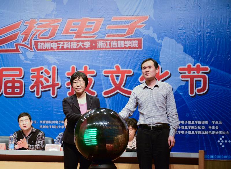 我校副校长孙玲玲、浙江传媒学院党委副书记宣裕方分别在开幕式上热情致辞,充分肯定了科技文化节在活跃校园科研气氛、提升学生创新能力、丰富学科专业文化等方面的作用,勉励两校学子借助科技文化节的平台,培养科研兴趣,陶冶艺术气质,将杭电学子的创新能力与传媒学子的艺术素养结合起来,共同打造自己的“中国梦”。两校领导还一起开启启动球,宣布第五届“飞扬电子”科技文化节开幕。