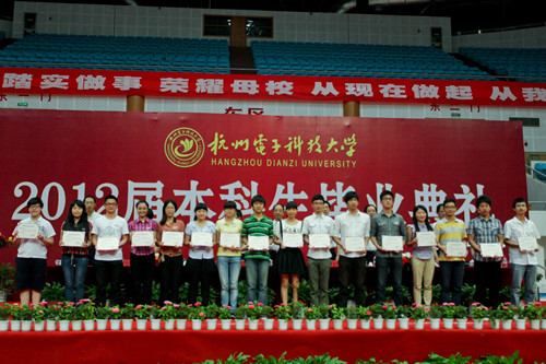 当天下午,学位授予仪式在下沙校区科技馆举行,由校长薛安克和各学院领导、教授代表组成的“主礼嘉宾”小组,在全场掌声中走上主席台。毕业生们每6人一组,鱼贯踏上红地毯,学院领导和老师亲切地为同学们拨学位帽上的流苏,并为同学们送上温馨的祝福。薛安克颔首微笑,为同学们一一颁发学位证书并与他们合影留念。今年,信息工程学院首次为毕业生颁发杭州电子科技大学信息工程学院学位证书,同学们从院长王晓萍手中接过证书,并兴奋地与校长拍照留念。(叶璟/文 焦点摄影/摄)