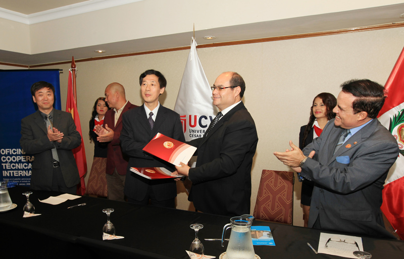 代表团访问秘鲁期间,受到塞萨尔瓦列霍大学常务副校长查韦兹教授等的热情接待。双方就学生交流、科技合作、共建实验室、派遣中文教师、成立孔子学院等议题进行了广泛而深入的讨论,并达成合作共识。在极其庄重的仪式中,薛安克校长代表我校签署了两校合作框架协议,为两校的进一步合作奠定了基础。