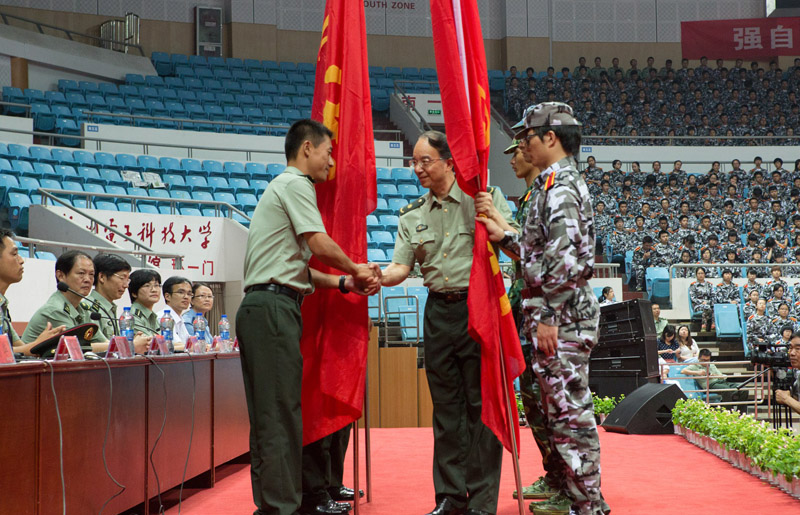动员大会上,军训师政委费君清向军训陆军团、海军团、空军团团长授旗。
