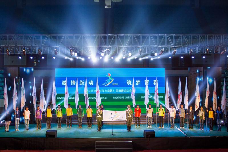 在阵阵催人奋进、激昂雄壮的鼓乐声中,21个方阵的运动员代表迈着整齐的步伐、精神抖擞地走入会场,展示了我校师生积极向上、拼搏进取的精神风貌。当外国留学生代表队高举写有“我爱杭电”四个醒目大字的牌子走入场内时,现场响起热烈的掌声。开幕式文艺演出分为“乐动青春”、“激情跨越”、“放飞梦想”三个篇章,师生们精心编排的节目将艺术的美感和体育的激情融为一体,为观众带来了一场别开生面的视听盛宴。我校兼职教授、国家一级演员徐宁与校艺术团舞蹈队合作,以一曲《江山》唱出了一代人的心声;校大学生艺术团、校拉丁舞队等带来的《运动年代秀》展示了从80年代至今运动时尚的变迁;校武术队带来的《中华武术魂》,一招一式皆有风范。最后,校领导、教工代表走上舞台合唱《祝福祖国》,为开幕式画上一个圆满的句号。