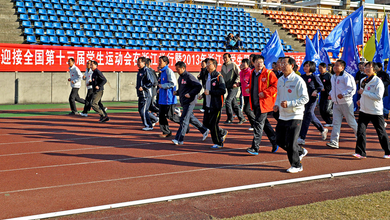 11月29日下午,以“奔向健康路,实现青春梦”为主题的全省学生阳光体育冬季长跑活动启动仪式在我校举行。省教育厅副厅长鲍学军、体卫艺处处长李建章,省大学生体育协会秘书长徐剑津,包括我校领导费君清、薛安克、陈畴镛、金一斌、孙玲玲、胡华、郑宁在内的下沙高教园区15所学校的相关领导出席启动仪式。