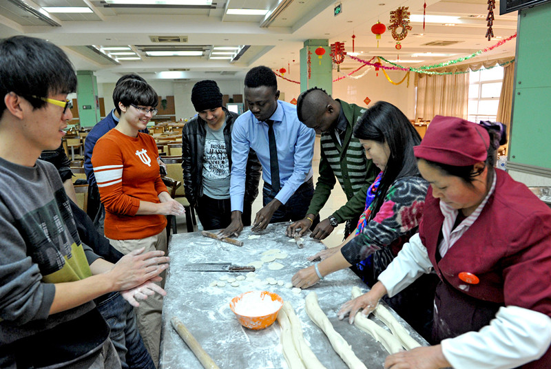 同样感受到浓浓的“中国年味”的还有留学生们。年夜饭上,来自尼日利亚的留学生Tayo跟着身边的中国同学学起了包饺子,放馅料,捏褶子,一板一眼,有模有样。今年是留学生们在学校度过的第一个春节,为了让他们更近距离地感受中国传统文化,学校为他们安排了丰富的“年俗”体验活动,包饺子、挂灯笼、贴对联……一个个充满中国味道的传统习俗,让他们爱上了最正宗的“中国年”。
