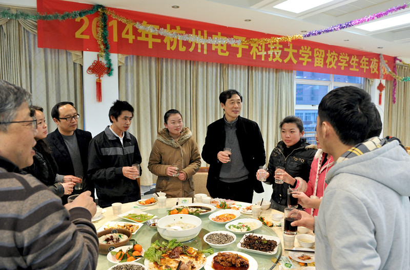 1月29日,下沙校区教工餐厅里一派热闹景象,校长薛安克、校党委副书记金一斌、副校长胡华以及各部门值班领导,与包括多位少数民族学生、留学生在内的40多名留校学生一起喜迎新年。师生们包饺子、拉家常,吃团圆饭,现场欢声笑语不断。