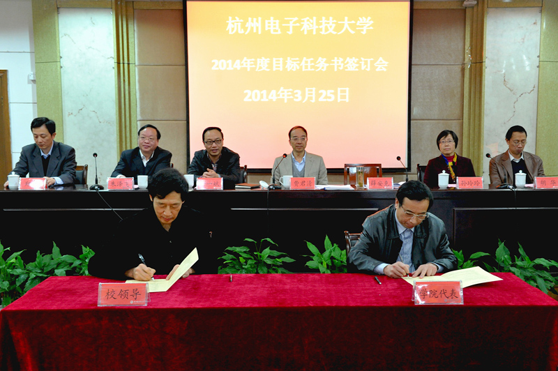 3月25日上午,学校召开2014年度目标任务书签订会。校党委书记费君清,校长薛安克,校党委副书记金一斌,副校长孙玲玲、朱泽飞、胡华、郑宁,各学院党委书记、院长以及职能部门负责人参加会议。会议由费君清主持。