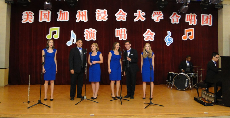 当晚,在校工会活动中心,加州浸会大学希望合唱团的学生们在钢琴、架子鼓、小提琴等乐器的伴奏下,为我校师生奉献了一首首动听的英文歌曲,赢得大家的热烈掌声。校党委副书记金一斌和林莱瑞副校长及数百名师生一道观看了演出。(国际交流合作处)