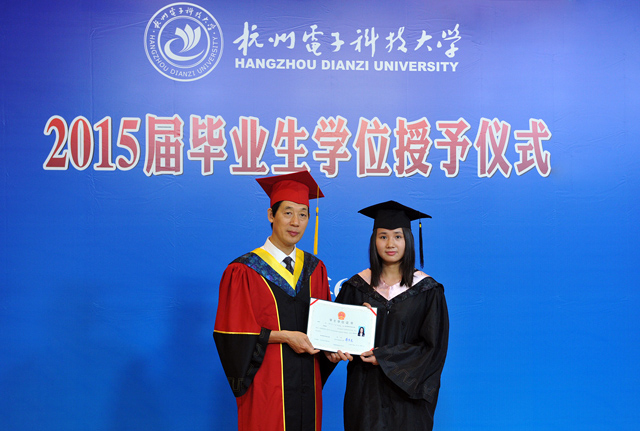 当天下午,学位授予仪式在下沙校区科技馆举行。校长薛安克为同学们颁发学位证书并与他们合影留念