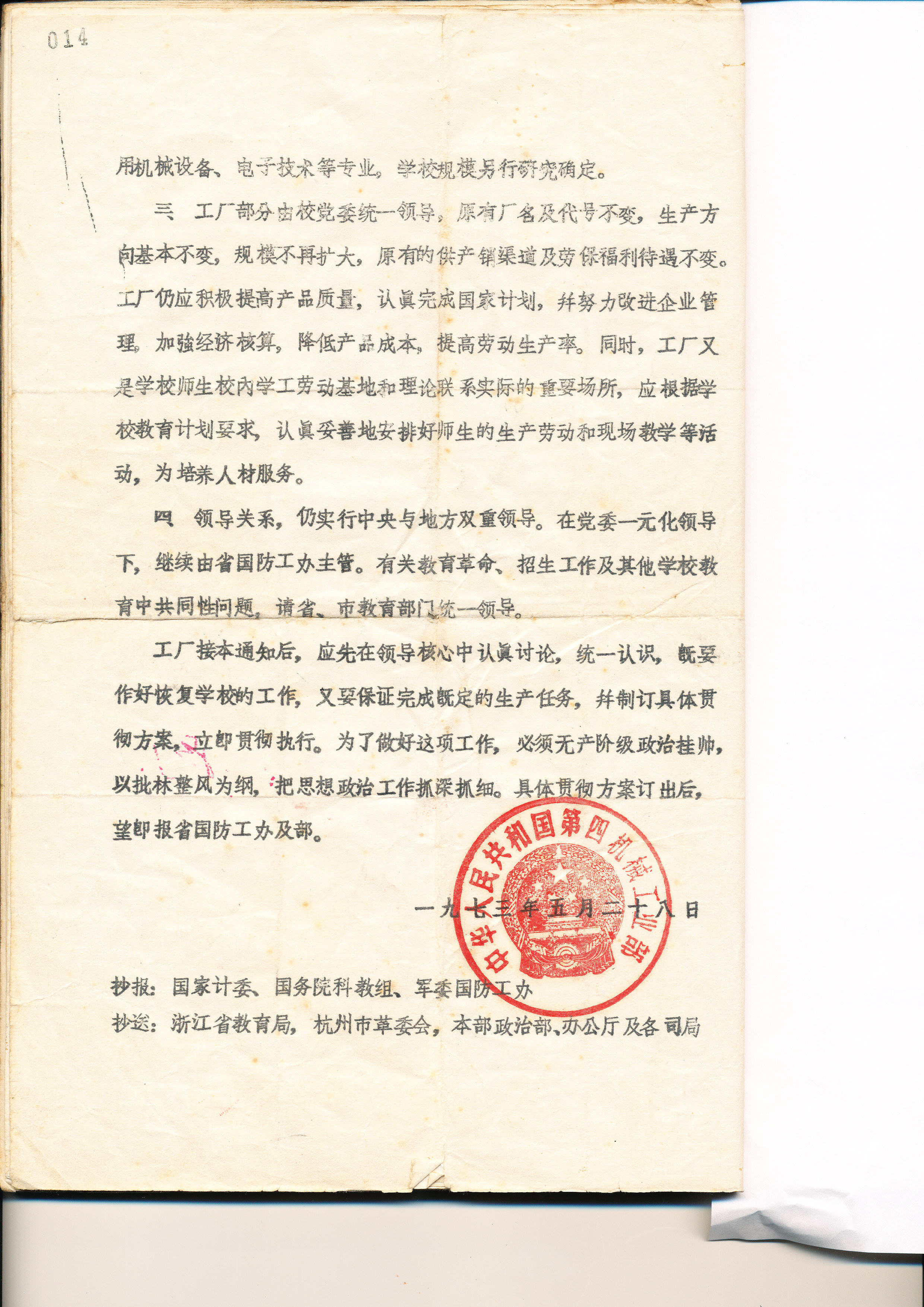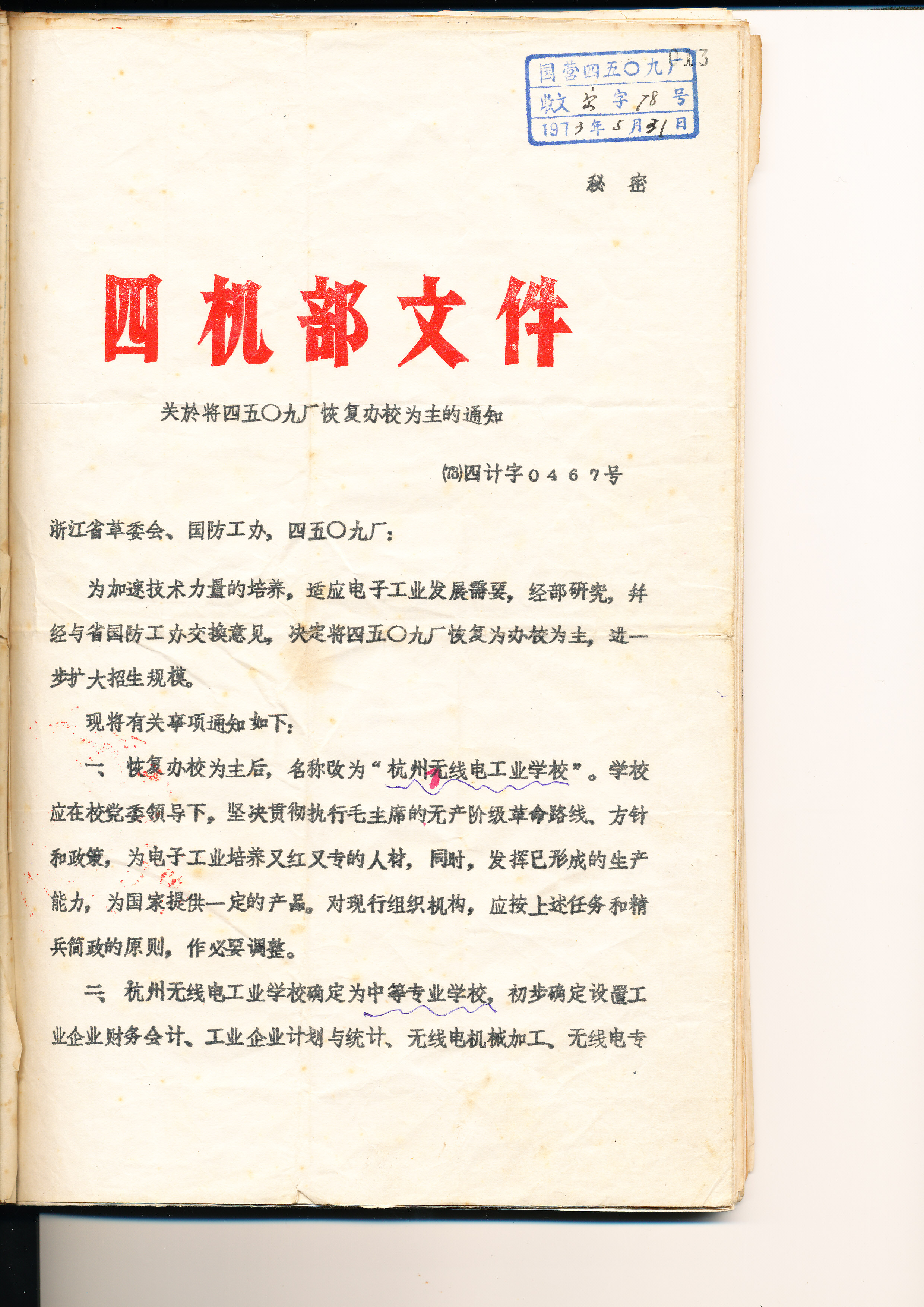 4、5:1973年5月,第四机械工业部《关于将四五〇九厂恢复办校为主的通知》