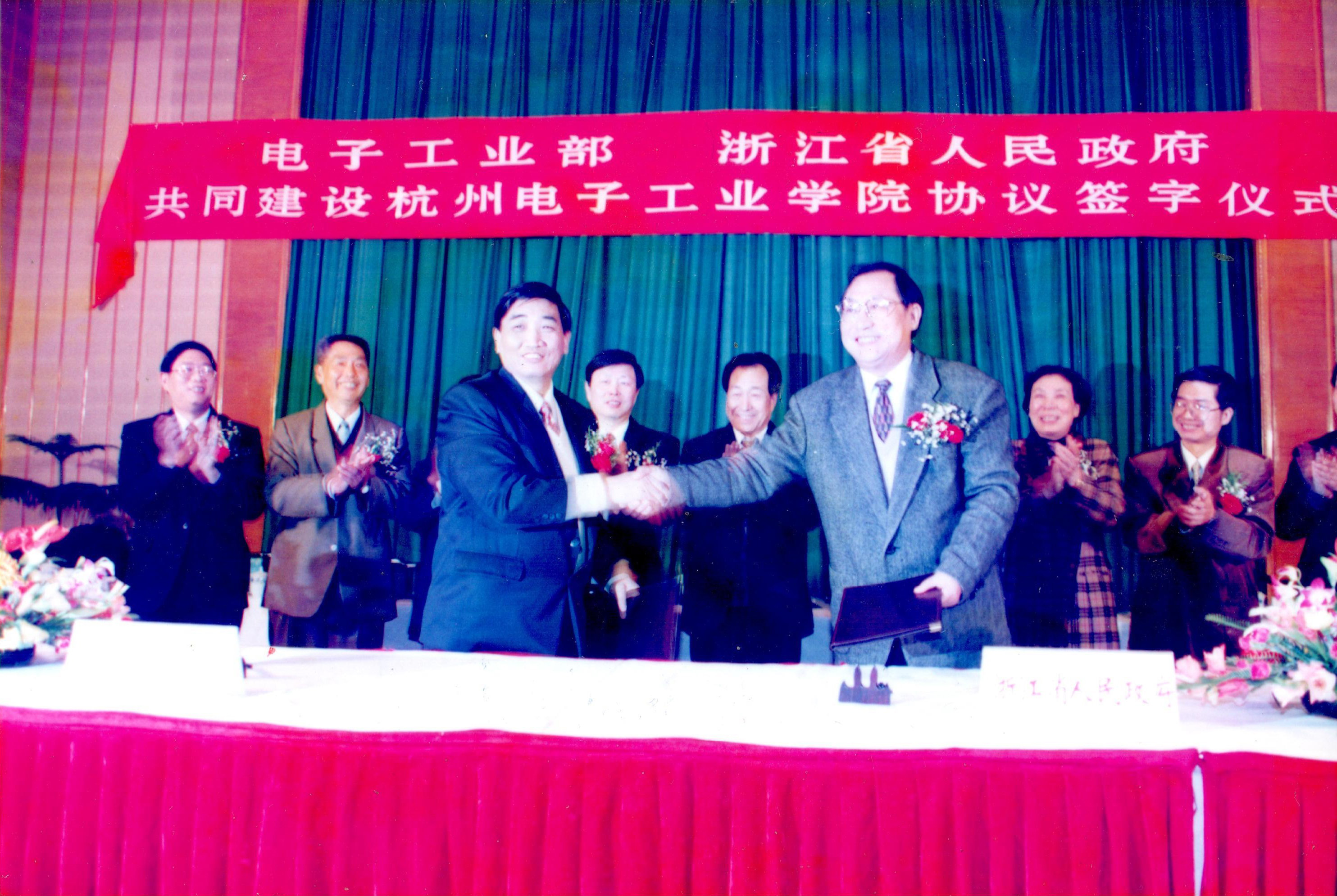 7、1997年12月,电子工业部副部长张文仪、浙江省副省长徐志纯签署共建杭州电子工学院协议