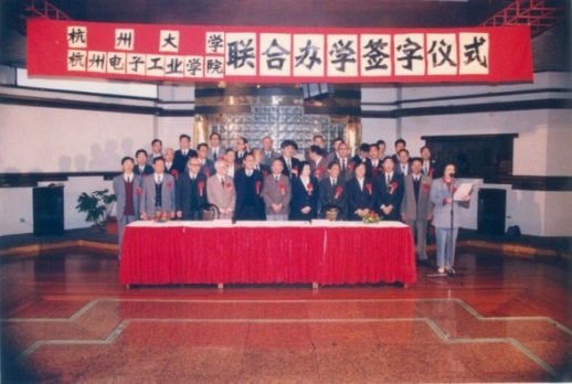 联合办学 1994年10月19日,杭州电子工业学院与杭州大学签订以合作形式实行联合办学的原则协议。协议签订后,两校积极开展了具有实质内容的合作办学活动,取得了一系列成果: