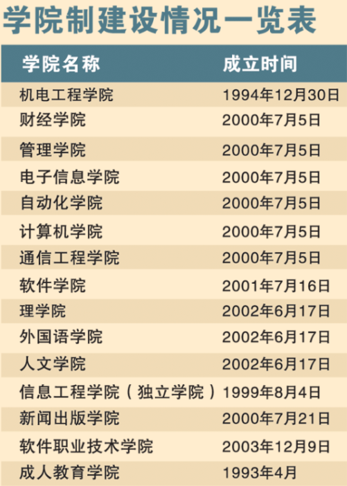 构建大学框架 2000年,学校优化二级学院布局,按照“有利于学校的长远发展,有利于学科专业建设,符合经济建设与社会发展需要”的原则,将原有的文理学院、机电工程学院、工商管理学院、信息工程学院等4个学院调整为机电工程学院、自动化学院、财经学院、管理学院、电子信息学院、计算机学院、通信工程学院和文理学院8个学院,之后,学校成立了省属高校第一家软件学院;撤消文理学院,设立理学院、外国语学院、人文学院;成立软件职业技术学院;成立信息工程学院,为独立学院。至此,加上早先成立的成教学院,学校的二级学院已覆盖全校所有的教学实体,学院制框架构建基本完成。