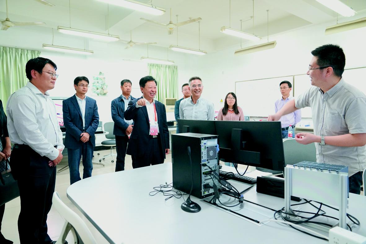 李树深院士一行参观了我校校史馆、微电子研究中心、我校与墨西哥蒙特雷科技大学联合共建的“远程控制实验室”和电子信息技术国家级虚拟仿真实验教学中心。微电子中心高级工程师冯春阳作了汇报,介绍了嵌入式固态微硬盘(eMMC)控制器芯片、加密U盘控制器芯片等科研成果。电子信息学院陈龙教授团队和李文钧教授团队分别汇报了实验室的建设情况。