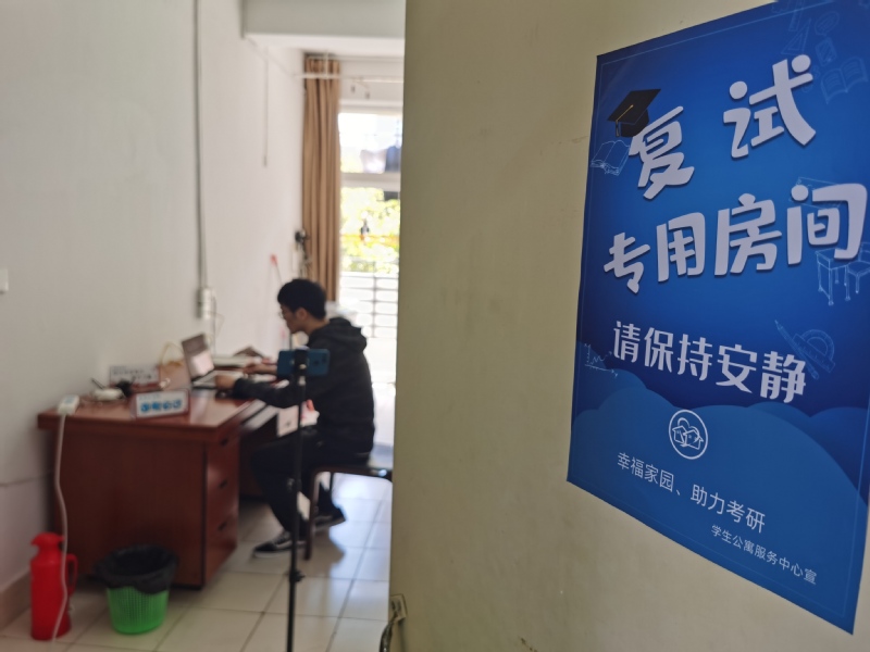 受疫情影响,“网络远程、异地现场”成为今年考研复试的主要形式。有的寝室3到5个学生同时考研,复试时间重叠,复试期间又需要相对安静、独立的空间,一时间为求的一处合适的复试场地,成为学生考研路上的又一件大事。了解到学生的需求,学生公寓服务中心将楼里能利用的房间都利用上,第一时间整理打扫出50间空余房间,接通水电,作为考研学子复试专用房间。在每个考研专用房间门上贴上醒目的考研复试专用房标志,提醒来往学生保持安静,并在房间内部放置励志桌签,为考研学子加油鼓劲。