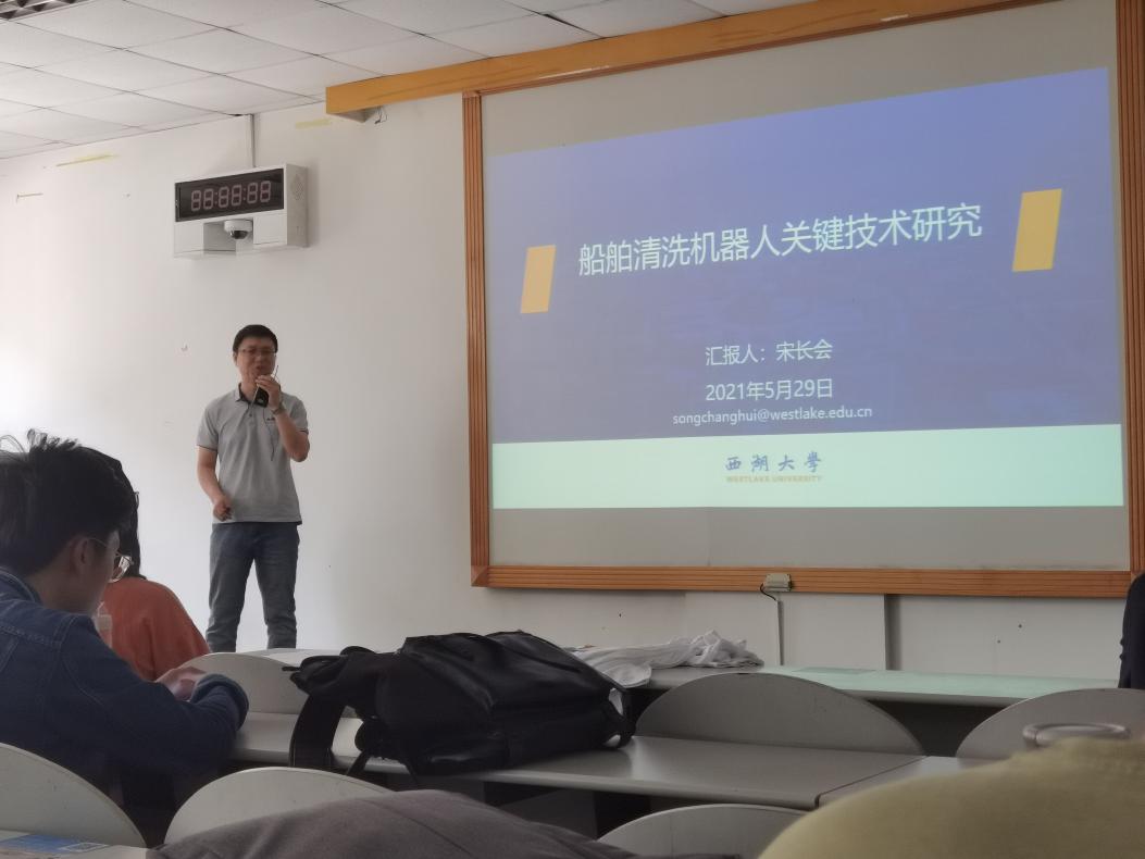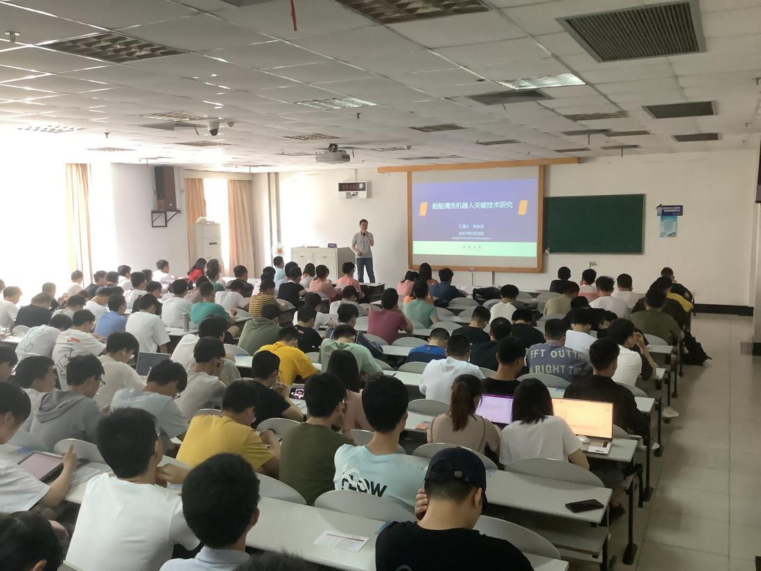 宋长会博士从崔维成教授的故事开始,现场给同学们播放了蛟龙号载人潜水器的海试视频及西湖大学深海技术研究中心的研究情况,从崔教授对这项科研事业的投入和研发工作中指出了载人深潜项目的非凡意义。随后,宋长会博士从船舶水下清洗的意义、关键技术与设备、我们的研究工作、讨论与展望四个方面讲述了船舶水下清洁机器人关键技术研究。让我们了解到了船舶水线以下的部位,特别是螺旋桨、舵机、进出水口等关键部位都容易被海生物附着,这些主要通过干船坞清洗、人工清洗、水下机器人清洗等方式进行清理。宋长会博士指出未来的研究可以朝着推力吸附、空化清洗、清洗残渣回收以及多机器人协同与自动清洗等方面努力探索。