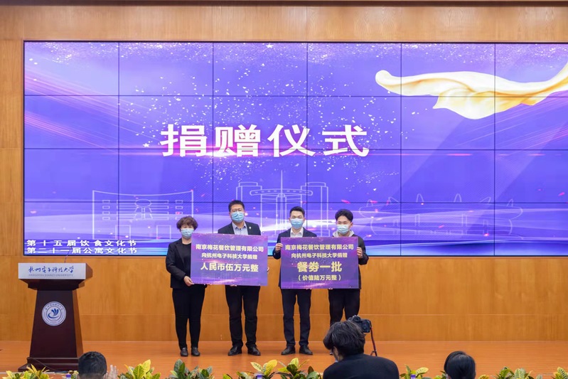 闭幕式现场由杭州华育教学设备有限公司、浙江惠美工贸有限公司、南京梅花餐厅管理有限公司组成的爱心企业,为我校捐赠了物资和现金用于支持大学生文化建设。