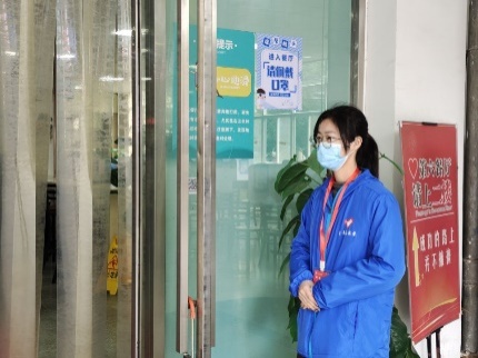 早上7:00,志愿者们统一佩戴口罩、身穿蓝色志愿服装,佩戴工作证,精神饱满地在校内各个餐厅进出口提醒师生佩戴口罩,告知师生增强自我防范意识,保持安全距离,做到不落一人。