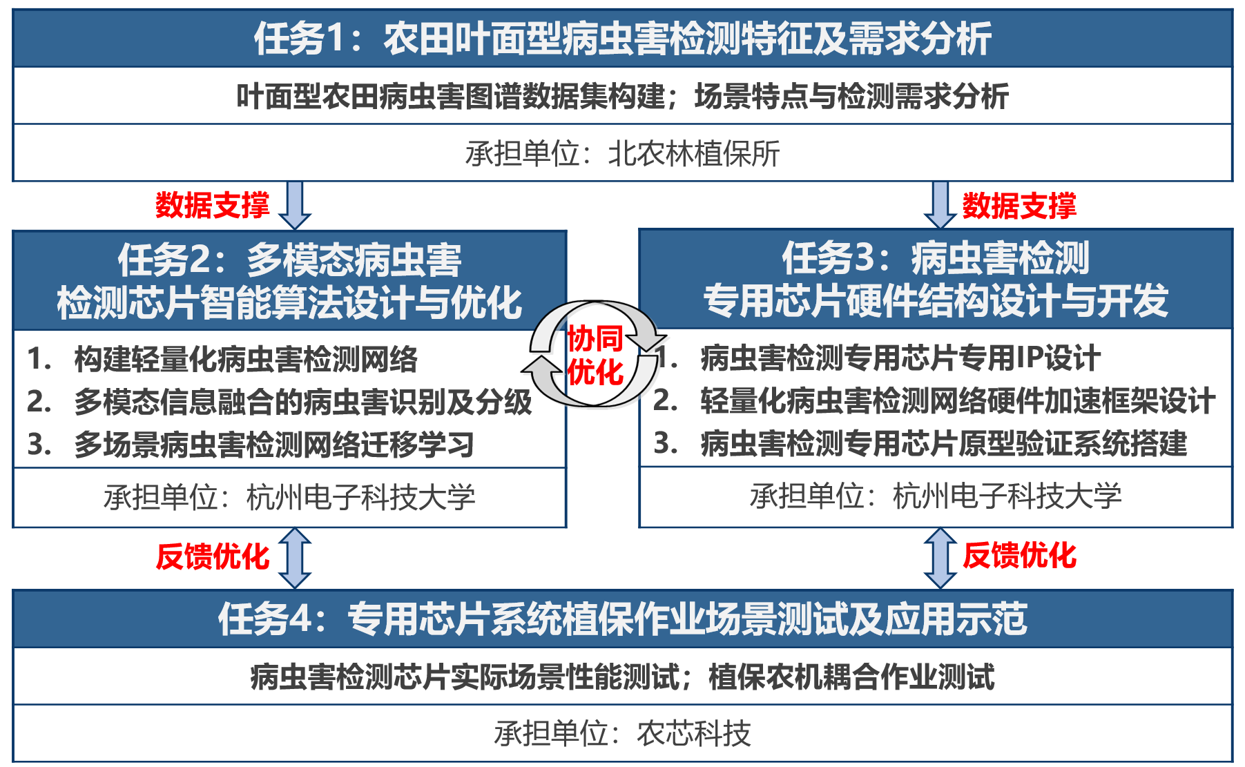 本项目针对“农业专用智能芯片开发”方向的指南要求,由杭州电子科技大学、北京市农林科学院植物保护研究所、农芯科技(北京)有限责任公司开展联合研究,围绕农田病虫害检测中的难点和痛点问题,针对叶面型病虫害的特点提出基于多模态信息的病虫害检测算法,针对植保智能农机实时检测需求开展病虫害检测专用智能芯片的软硬件协同优化设计,为农田病虫害检测智能仪器的研制提供关键技术。本项目将重点攻关突破我国在农业专用芯片上的“卡脖子”技术,为实现病虫害检测器件的微小型化,掌握农业关键器件方面的核心技术,促进病虫害精准、绿色防控和减药控害提供关键技术支撑。