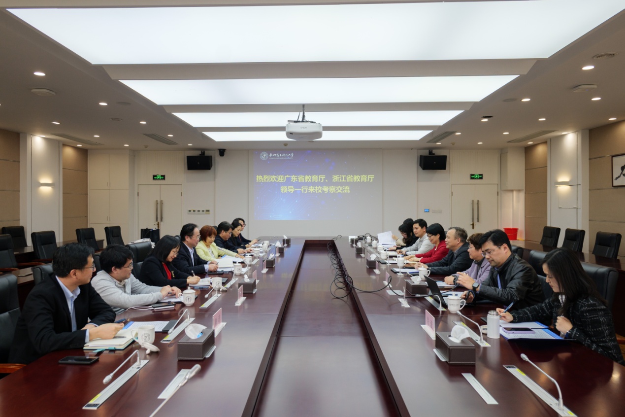 杨勇副校长对广东省教育厅、浙江省教育厅、广东省高校领导和专家来学校考察指导表示热烈欢迎,介绍了我校国际交流合作战略布局和“十三五”以来国际化工作服务学校、学院、学科、师生发展的成效。李金俊处长对我校在贯彻落实《教育部等八部门关于加快和扩大新时代教育对外开放的意见》和浙江“打造全国高质量教育对外开放发展高地”政策背景下,结合学校发展目标做好国际化办学顶层设计、努力提升学校国际化办学水平、取得丰硕成果给与了高度评价。
