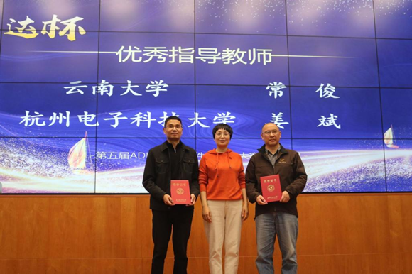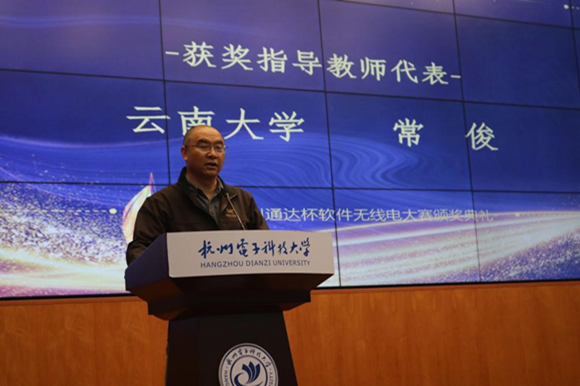 接下来是进行获奖教师颁奖,云南大学常俊老师和杭州电子科技大学姜斌老师获得优秀指导教师荣誉称号。常俊老师表示,软件无线电大赛是一个非常有意义的比赛,不仅帮助学生对无线通信系统的认知,还磨练了参赛师生坚持不懈、敢于挑战的竞赛精神,并可以将其延续到以后的学习工作中去。
