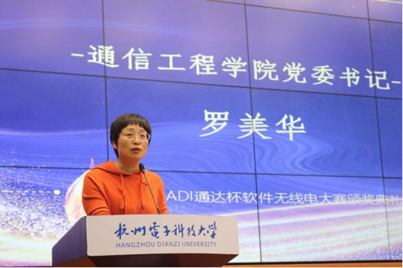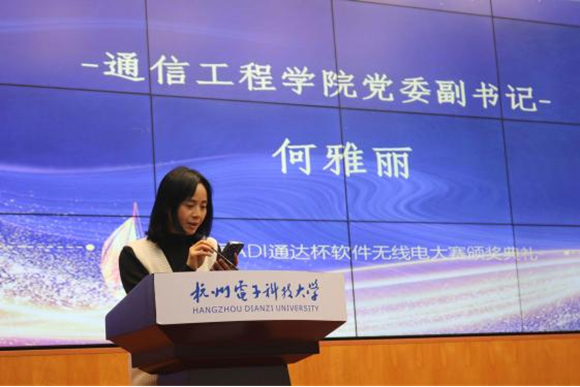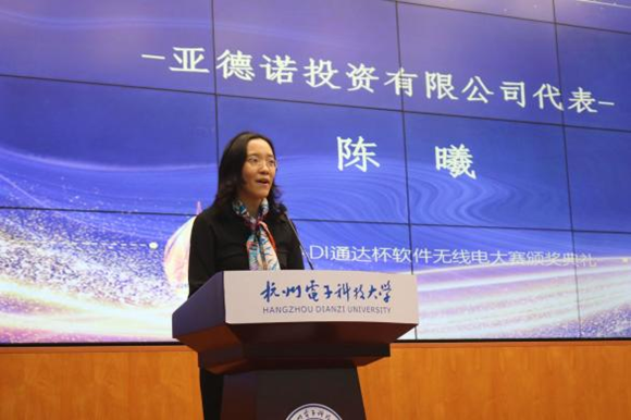 随后,亚德诺投资有限公司陈曦经理发表了对本次比赛的感言,肯定了本次参赛队伍的专业知识与动手能力,同时表达了与杭电继续合作举办类似比赛的意向,以及对下一届ADI通达杯软件无线电大赛的展望。她表示,为了能更好地培养学生们的创新实践能力,实现“以赛促学、以学促用”的比赛宗旨,希望在多方共同努力下,不断积极进取、开拓创新,将该比赛做大做强。