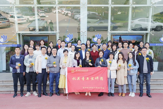 杨潇怡代表青年理论学习小组和青年宣讲团发出“杭电机关青年干部要以主题教育为契机,学思想、强党性、重实践、建新功。坚持学思用贯通,知信行统一。学以铸魂、学以增智、学以正风、学以促干,切实把学习成果转化为服务学校中心发展的实际成效,杭电发展我光荣,青春奋进正当时。”的青春号召。
