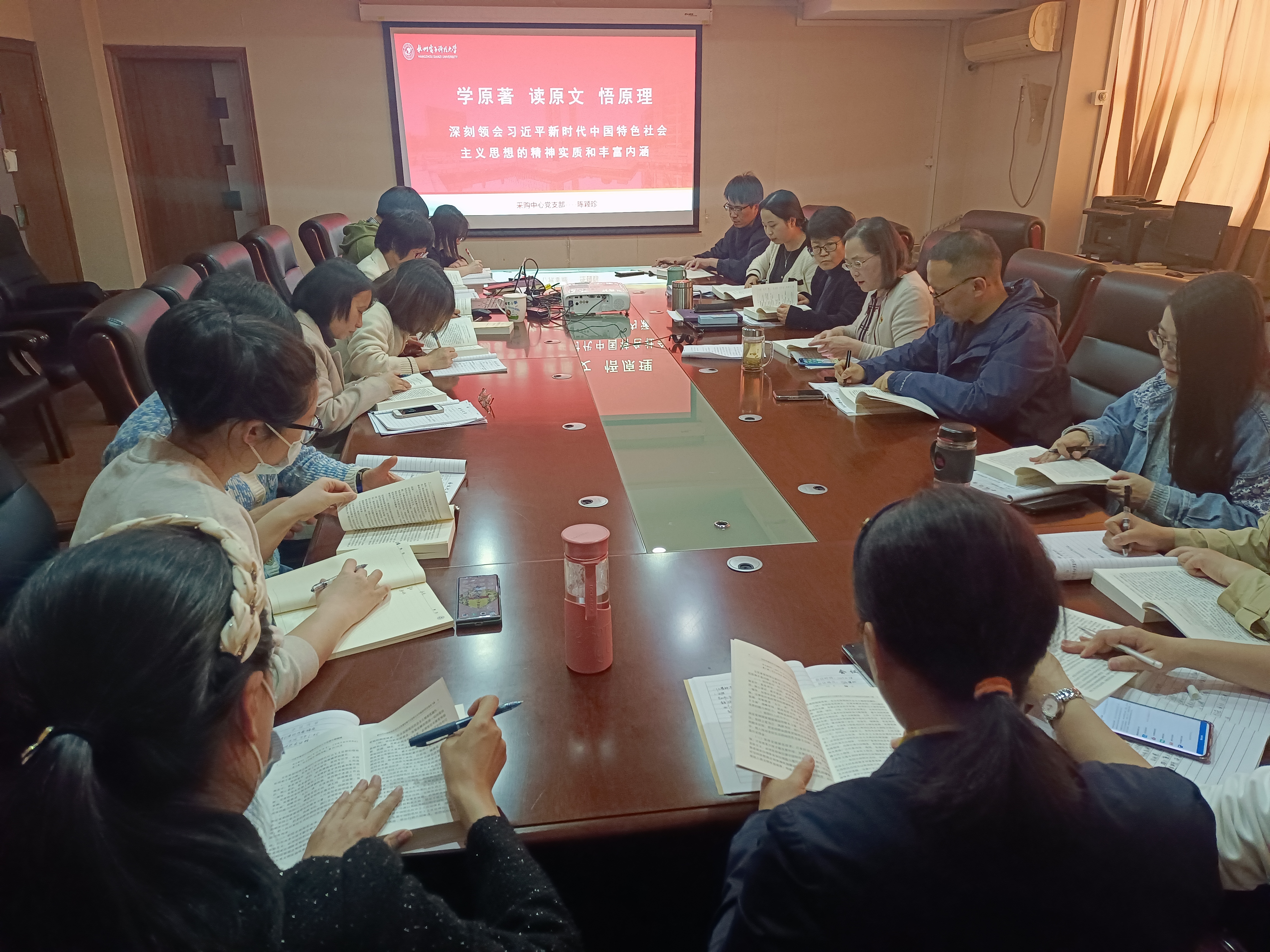采购中心党支部书记陈颖珍会上介绍了《习近平新时代中国特色社会主义思想专题摘编》等主题教育指定书目,并带领党员学习了关于“十四个坚持”的论述,引导党员干部原原本本学,积极主动学,笃信笃行学,使习近平新时代中国特色社会主义思想真正成为党员干部的“必修课”,深刻认识教育工作是国之大计、党之大计,自足岗位职责,做到知行合一,学以致用。