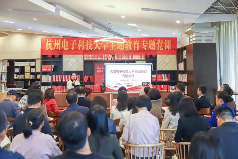 在专题党课中,党委副书记钱波分享了在省管领导干部主题教育读书班的学习体会。她强调,要深学笃行习近平新时代中国特色社会主义思想,牢记“国之大者”,旗帜鲜明讲政治,坚守“为党育人、为国育才”初心,充分发挥浙江作为“红色根脉”的独特优势,全面贯彻新时代党的建设总要求,切实加强党对高校的全面领导,把党的政治优势、组织优势转化为事业发展优势;聚焦立德树人根本任务,发挥铸魂立心作用,突出新思想引航指向,积极构建符合新时代教育规律和青年成长成才需要的育人体系,引导广大青年“坚定不移听党话、跟党走”。她提出,要从“培养高质量的数字人才”“把主题教育融入立德树人全过程”““聚焦‘卡脖子’技术攻坚克难”以及“服务‘两个先行 ’彰显教育担当”这四个方面着手,使主题教育活动开展体现出教育味、杭电味和科技味。
