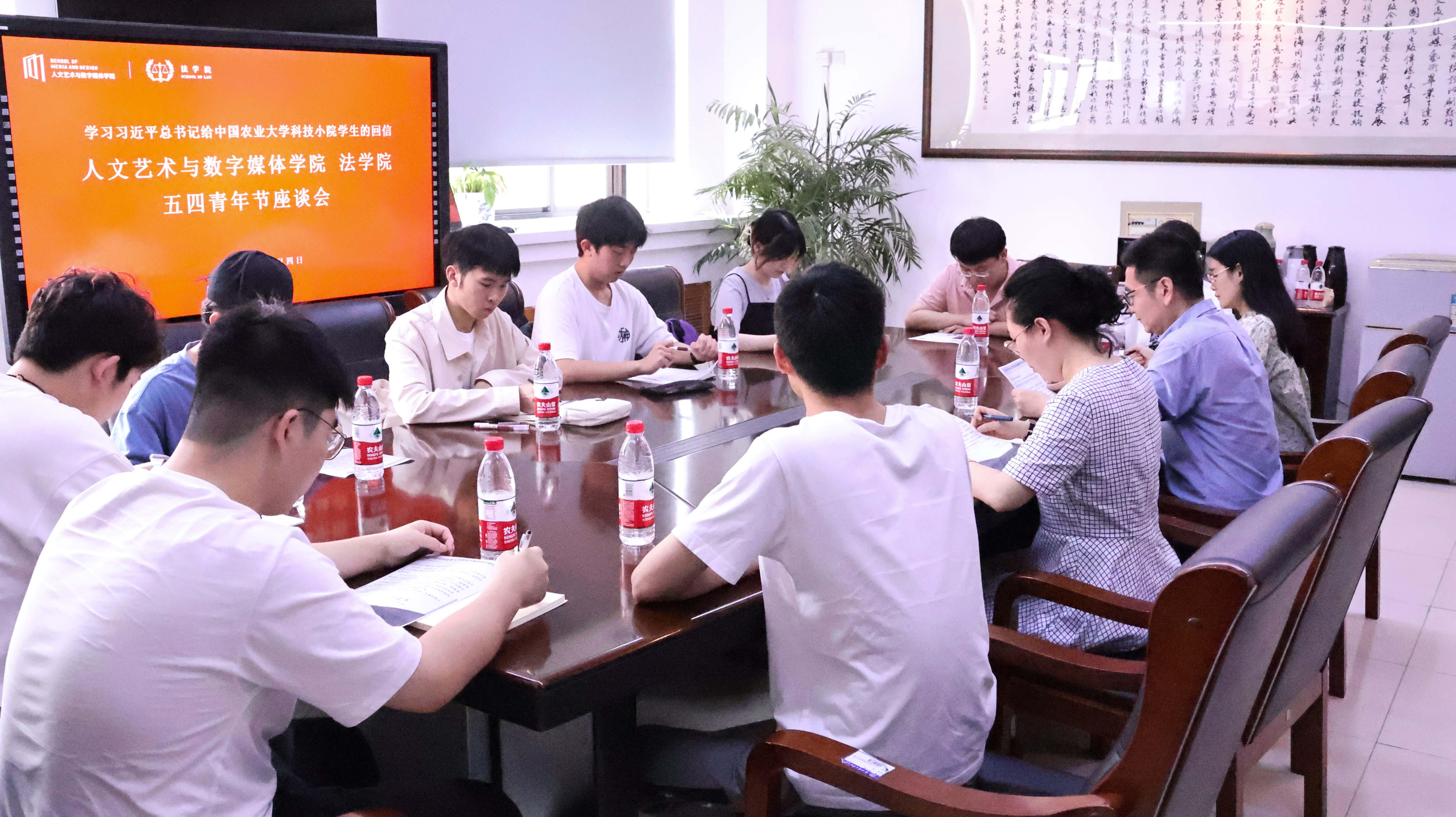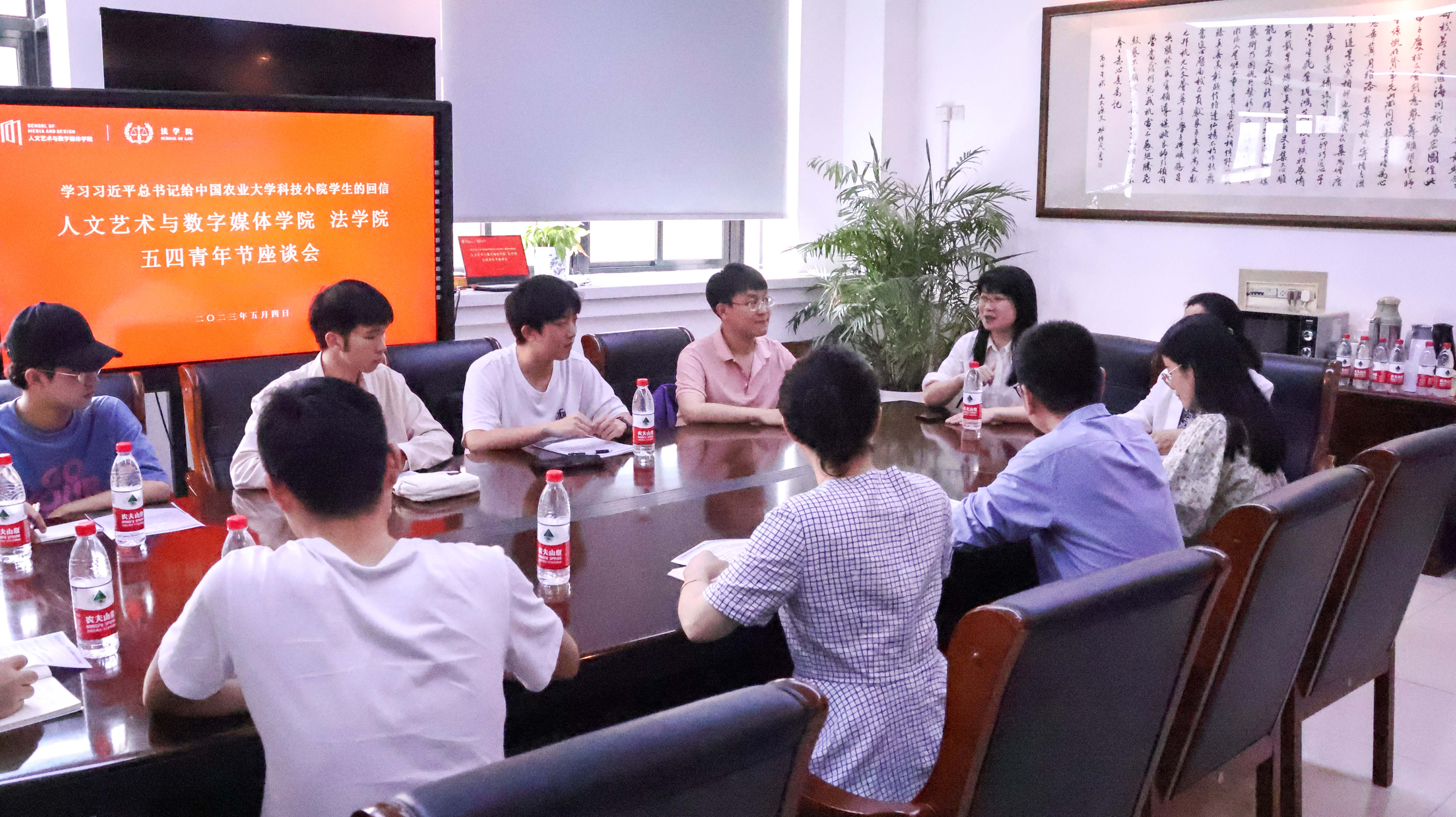 为深入学习贯彻习近平新时代中国特色社会主义思想主题教育,引导全院青年师生继承和发扬五四精神,5月4日下午,人文艺术与数字媒体学院 法学院举行五四青年节座谈会。学院党委副书记周巧红、学院党委组织员丁伟妃、学工办主任刘洋与青年师生代表参加座谈会,共同学习领悟习近平总书记给中国农业大学科技小院学生重要回信精神,交流感悟,畅谈理想,共话担当。