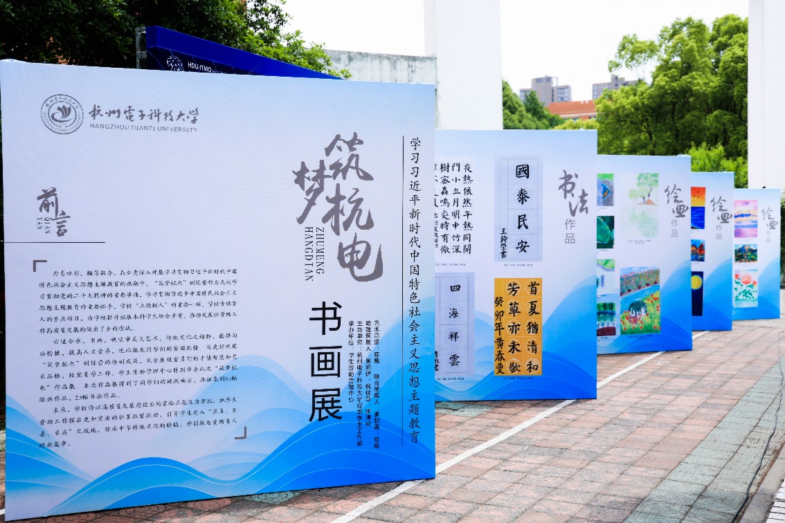 为了展示同学们的学习成果,学校在学生活动中心西侧举办“筑梦杭电”书画展。本次画展共展出绘画作品65幅,书法作品23幅,展出作品均由本期学员亲笔创作。