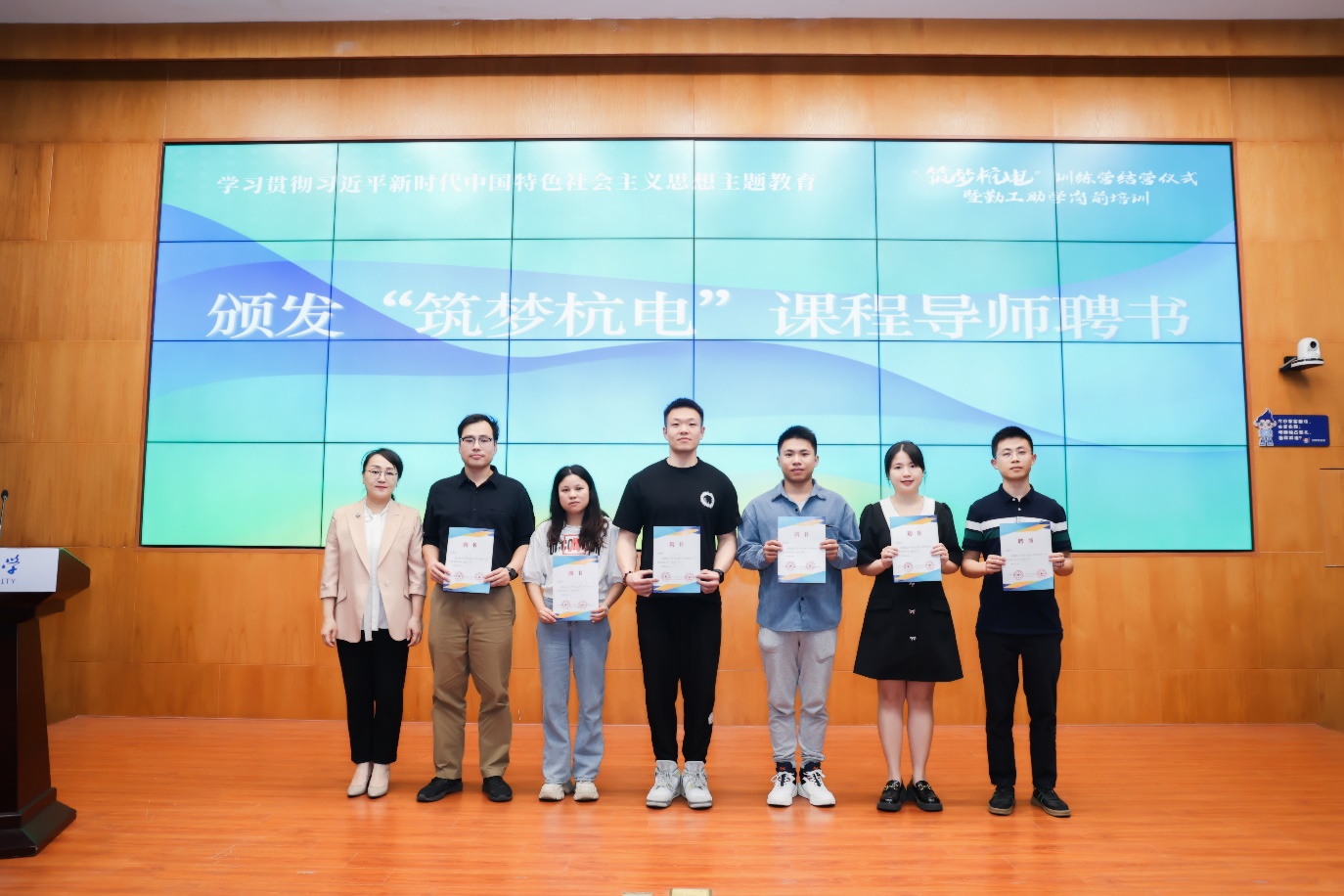 钱波为“筑梦杭电”课程导师书法导师自动化学院倪佳慧老师、通信工程学院胡清泉老师;园艺导师后勤集团陈健老师、戴玉凤老师;健身导师原浩然老师;声乐导师学校合唱队队长会计学院王贤昌同学颁发聘书。