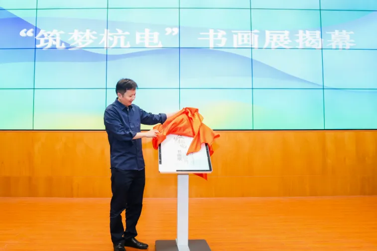 校党委学工部部长陈巍为“筑梦杭电”书画展揭幕