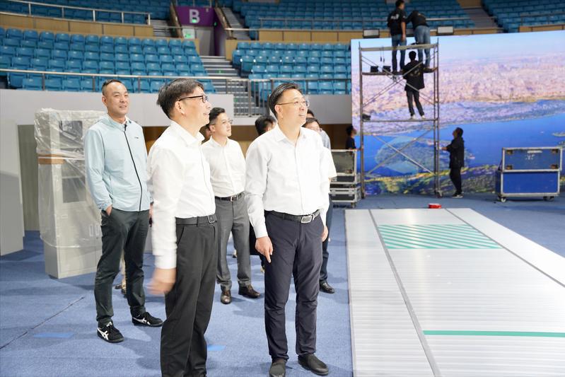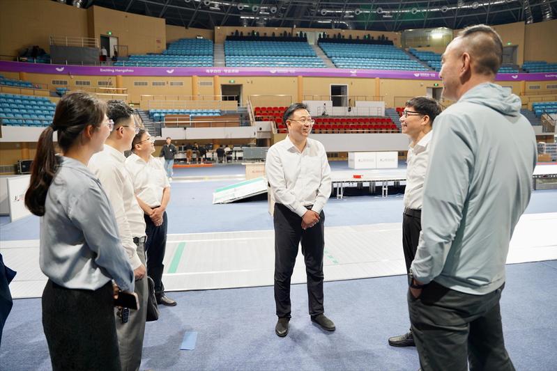阮重晖在实地勘探了亚运击剑决赛馆、预赛馆和热身馆后,调研了杭州亚运会杭州电子科技大学场馆群的办赛进展、击剑赛事特征、工作人员与志愿者概况等,详细询问并了解了测试赛准备情况。